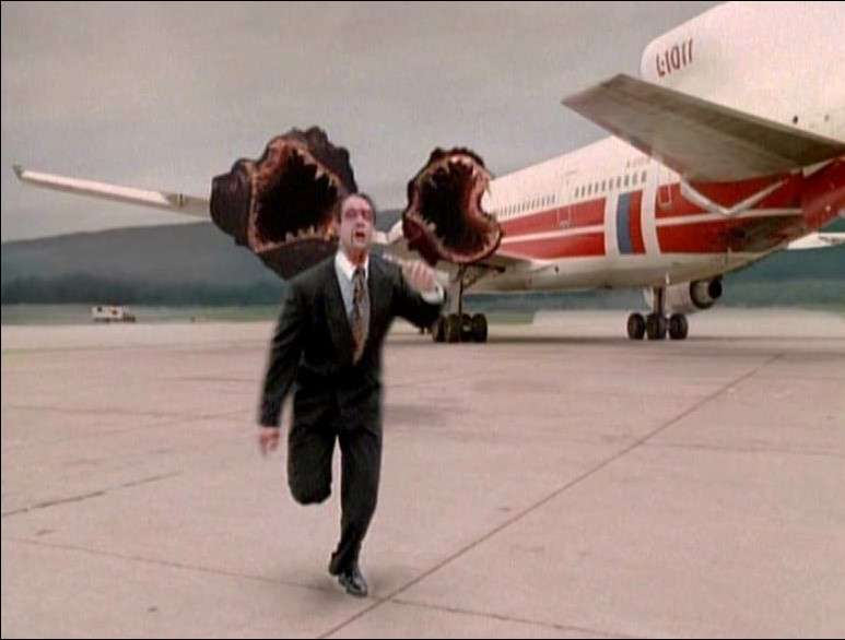 Soudain, les Langoliers surgissent : ce sont des bouches ambulantes, terrifiantes, aux crocs aiguisés. Craig se fait alors dévorer avec tout ce qui l’entoure, ce qui permet à l’avion de décoller. Bob pense que l’objectif des Langoliers est de nettoyer ce qui reste du passé en l’engloutissant. Entre-temps, Dinah succombe à ses blessures, et l’avion, reparti pour Los Angeles, retrouve la faille temporelle au-dessus du désert. Bob réalise cependant que les passagers doivent être endormis au cours de la traversée, faute de quoi, ils disparaîtront pour toujours. Il faut dépressuriser la cabine pour que tout le monde tombe dans les vapes…mais il faudrait qu’un passager au moins reste conscient et se sacrifie, pour re-pressuriser le tout juste avant que l’avion n’entre dans la faille. Nick, diplomate anglais, se porte volontaire, car il veut expier une faute du passé, lorsqu’il a par erreur abattu trois enfants irlandais. Il se sacrifie, et les autres sont sauvés.